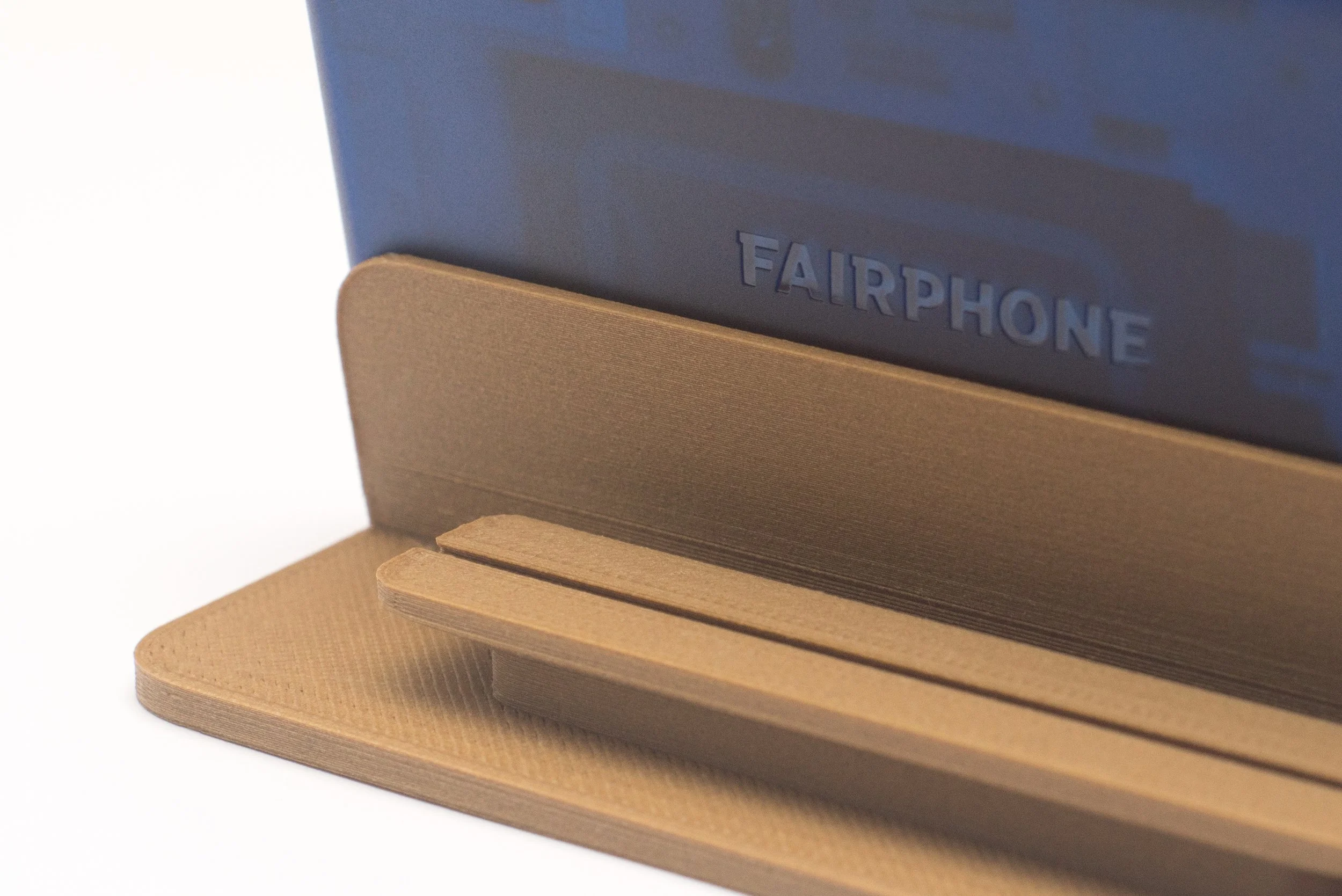 For this purpose, Fairphone started a cooperation with 3D Hubs and designer Alan Nguyen. Together they created the first wooden phone accessoires, specially made for Fairphone. The set exists of a dock and an amplifier. For these accessoires, Alan Nguyen used the wooden filament called 'ColorFabb woodFill 3D'."